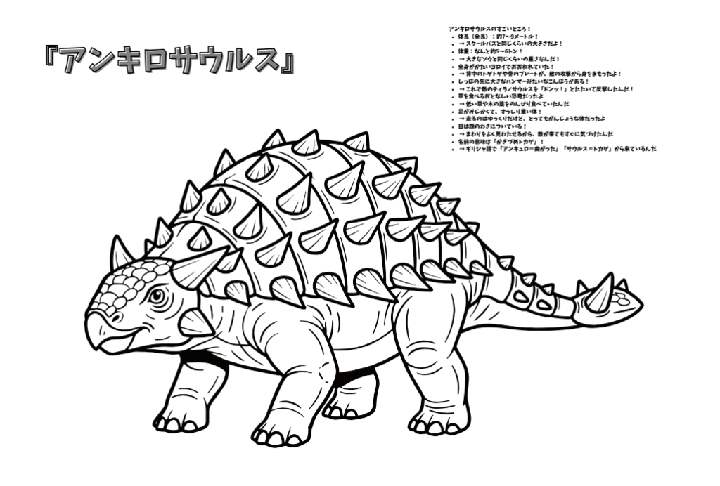 どの恐竜も、図鑑スタイルで「すごいところ」や「豆知識」も紹介しているよ!塗って学べる、楽しい恐竜ぬりえ図鑑です。