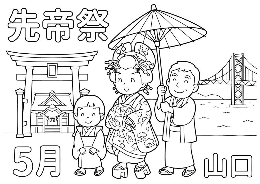 - 特徴: 白背景・黒線のみ・塗りやすい太線・シンプル構図・文字入り(先帝祭/5月/山口)