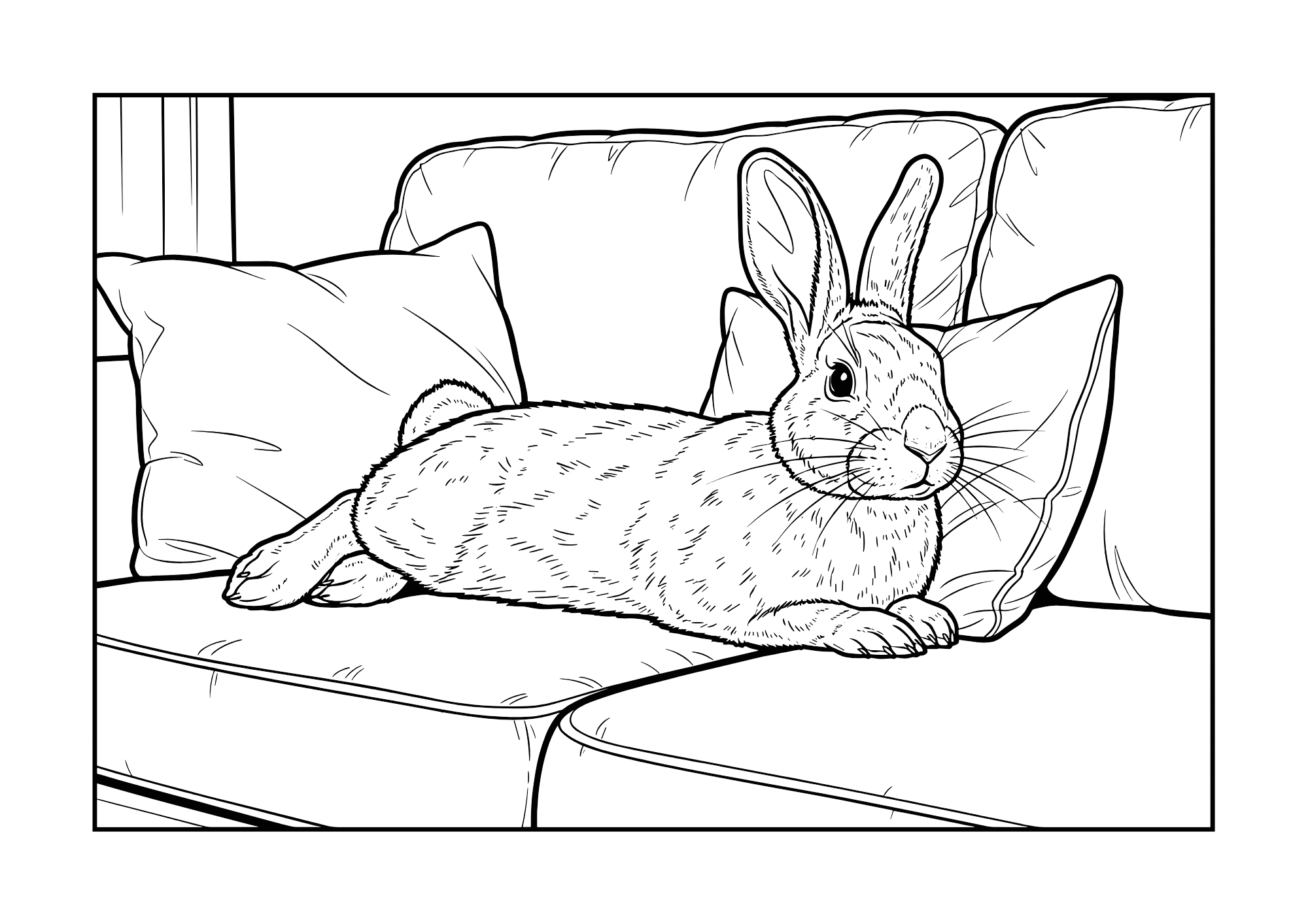 高齢者の方におすすめの、簡単・リアル・かわいいうさぎのぬりえ素材です。ソファーの上でリラックスする自然なポーズが魅力で、ちぎり絵や貼り絵の下絵としてもご活用いただけます。線が太くて見やすく、ぬり絵初心者の方でも安心して楽しめる内容です。