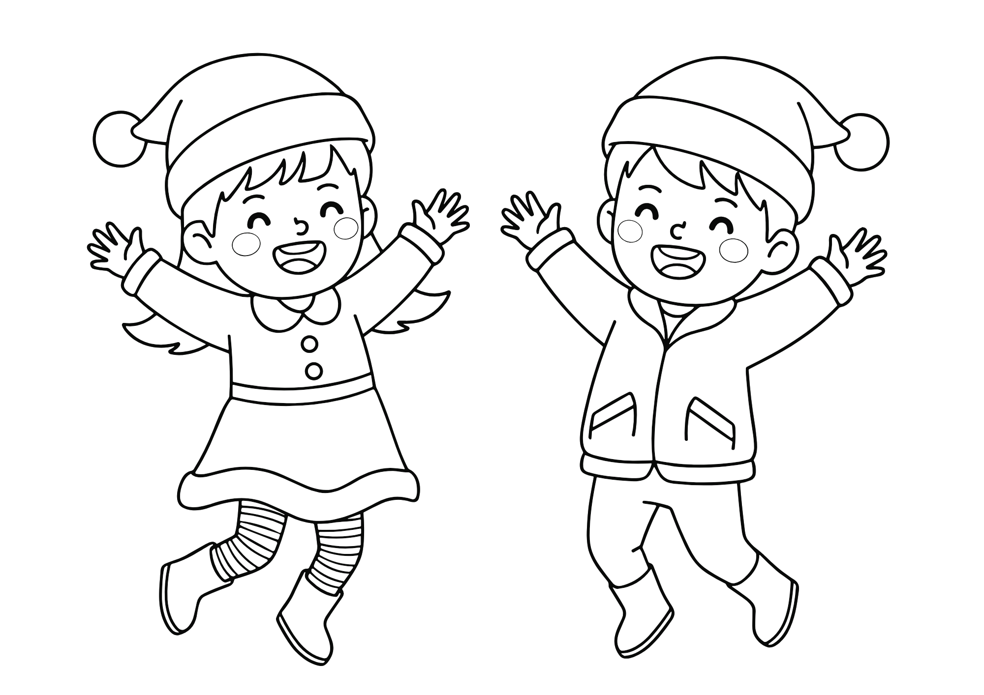 サンタの衣装を着た男の子と女の子が、楽しそうにジャンプする姿がかわいいぬりえ素材です。明るく楽しい構図で、3歳から塗れる幼児向けのやさしい線画となっています。色鉛筆で彩色した見本付きで、塗り方の参考にもなるため、家庭や保育園、高齢者施設のレクリエーションにもおすすめです。