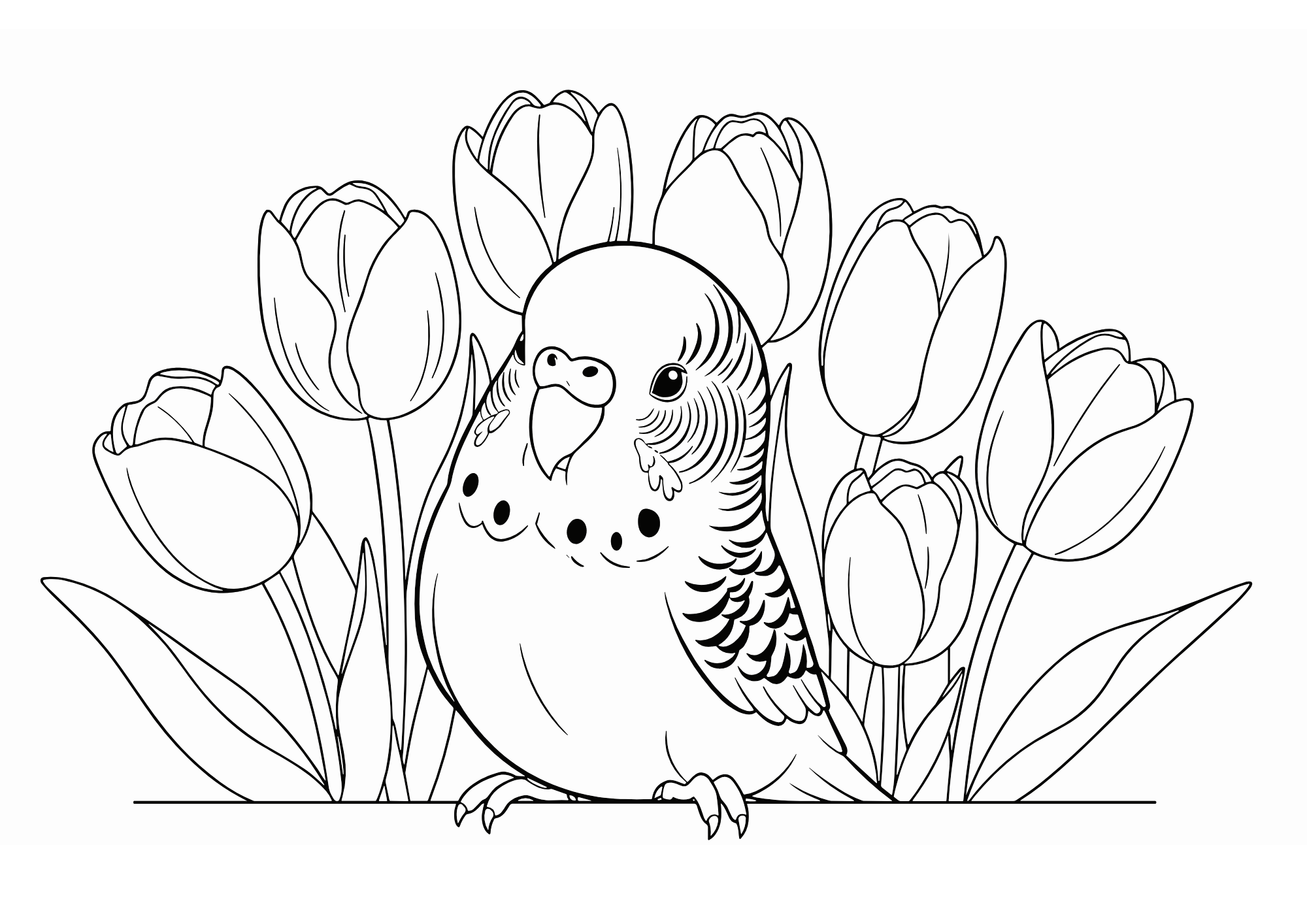 セキセイインコとチューリップの塗り絵|春の花と小鳥|高齢者向け無料ダウンロード