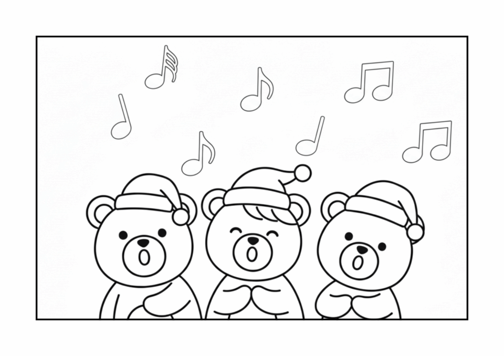 冬の季節にぴったりな、くまたちが歌う合唱のぬりえイラストです。サンタ帽をかぶった3匹のくまが楽しそうに歌っている構図で、お子さまの創造力を広げながら楽しく色を塗ることができます。