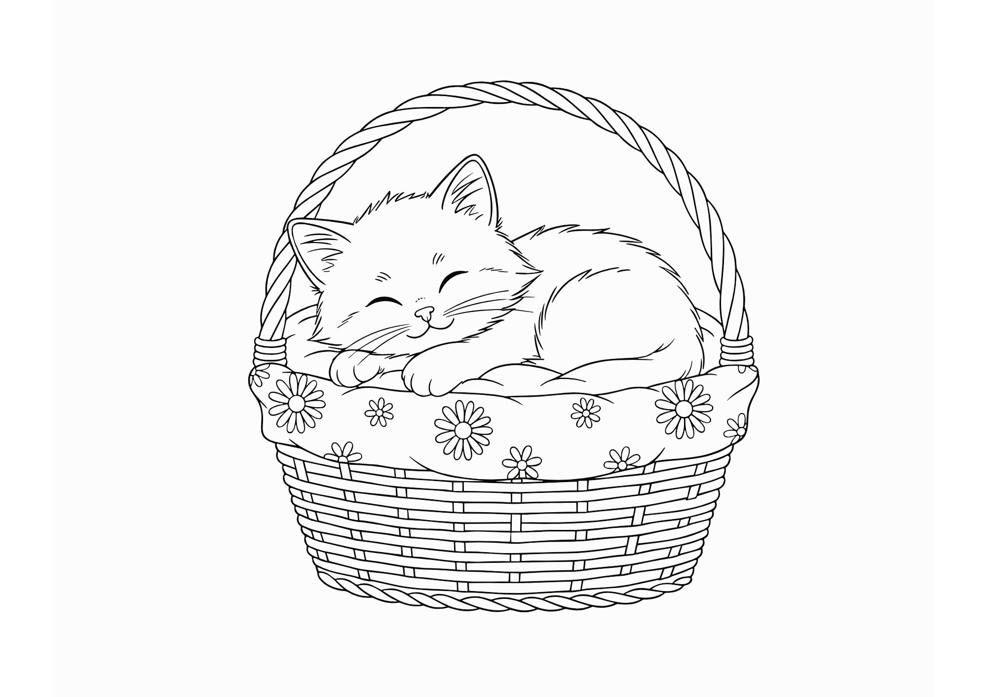 かごで眠る子ねこの塗り絵|高齢者向け癒しのぬりえイラスト
