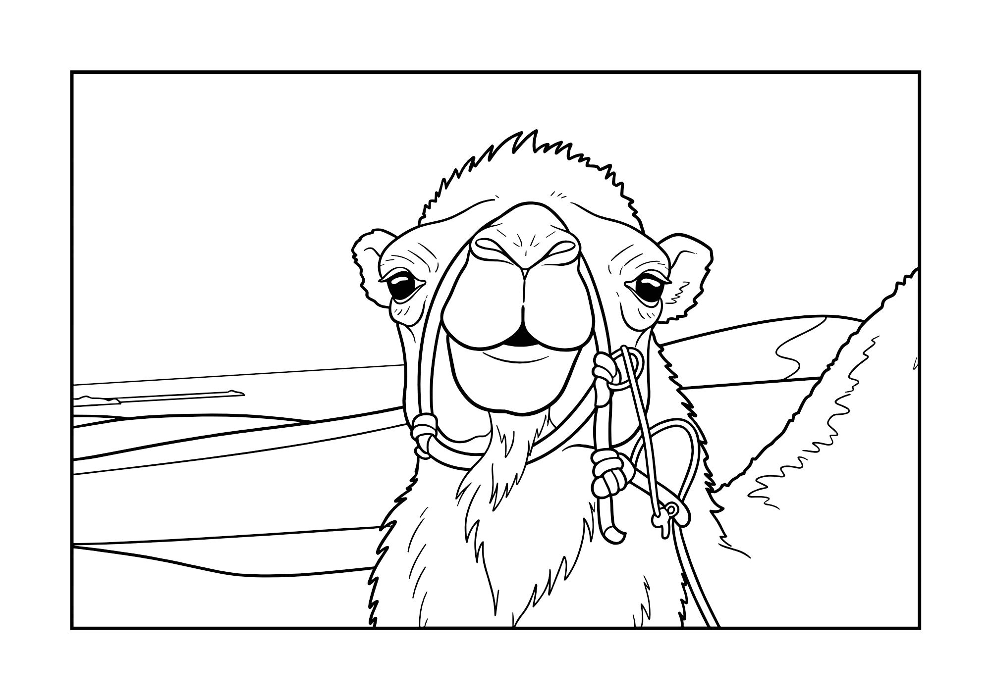日本の名所「鳥取砂丘」を背景に、らくだが大きく描かれた高齢者向けぬりえイラストです。なだらかな砂丘の曲線と、表情のやさしいラクダの構図が特徴で、指先の運動やちぎり絵レクにもぴったり。旅行気分や昔の思い出を語り合う回想レクリエーションにもおすすめです。