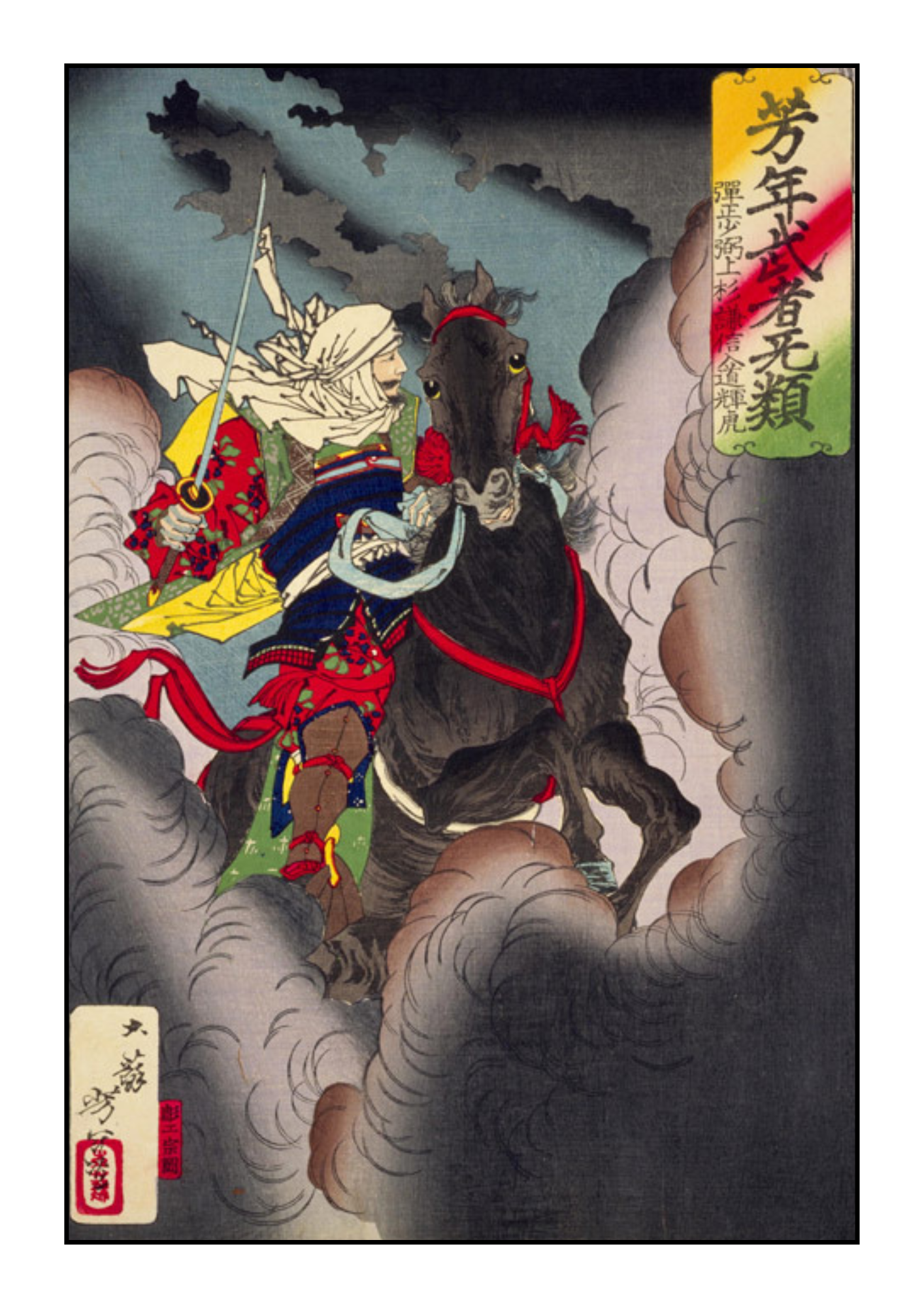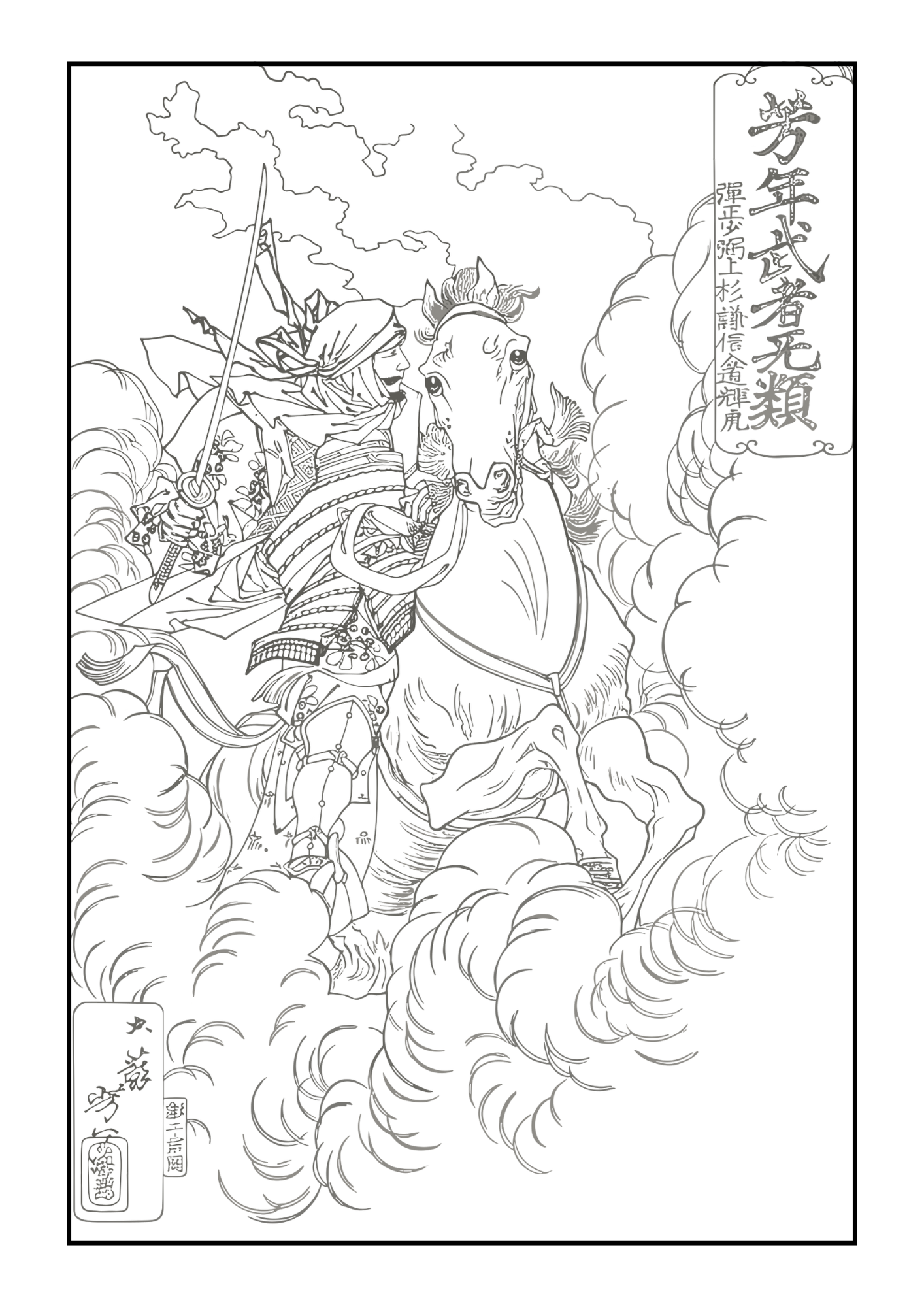 戦国時代の名将・上杉謙信を描いた浮世絵「芳年武者无類(よしとしむしゃぶるい)」をもとに、高齢者向けの塗り絵イラストとして再構成しました。月岡芳年による力強い騎馬姿と戦場の躍動感を、太めの黒線で丁寧に描き起こしています。歴史が好きな方や、武者絵に興味がある高齢者の方にもおすすめのぬりえ素材です。