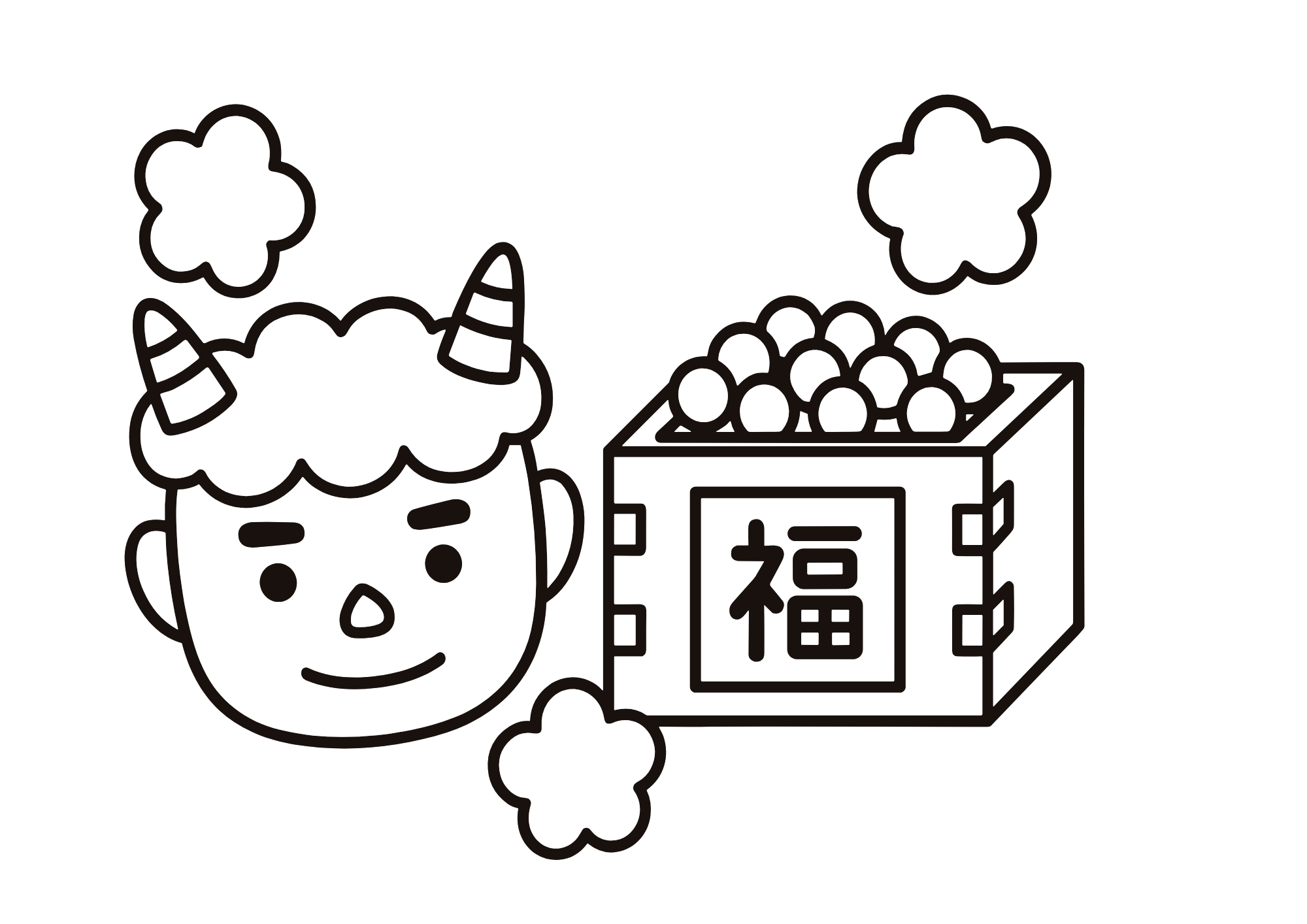 2月の季節行事「節分」にぴったりな、おにの顔と「福」の升に豆が入った塗り絵イラストです。かわいいおにの表情と、豆が山盛りに入った升、周囲に配置された梅の花が楽しい雰囲気を演出します。保育園や家庭での行事制作、おたよりの挿絵にも最適です。