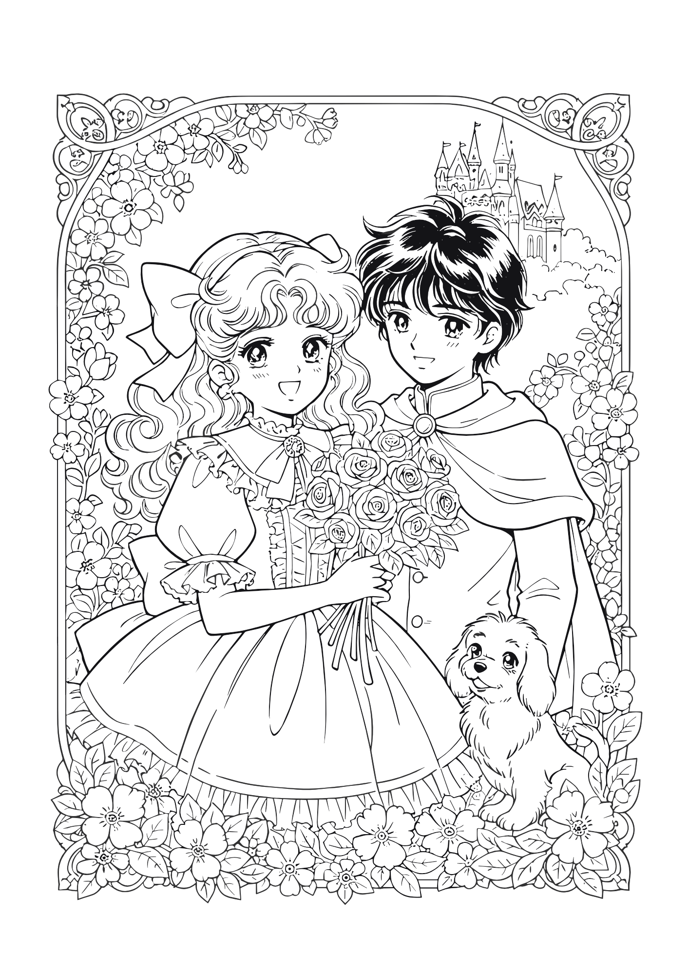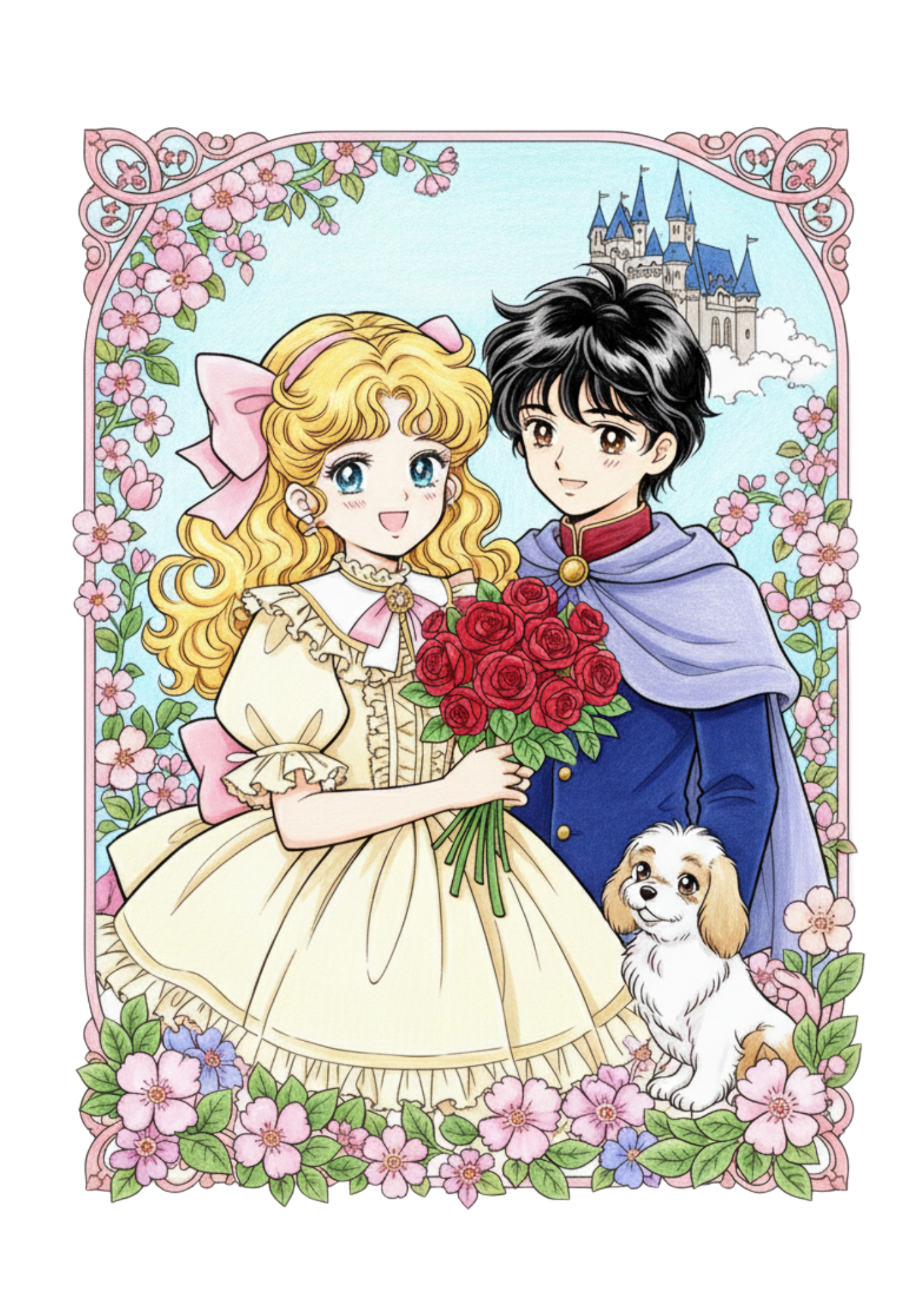 • モチーフ: 昭和レトロ風のお姫様と王子、子犬、花のフレーム、お城