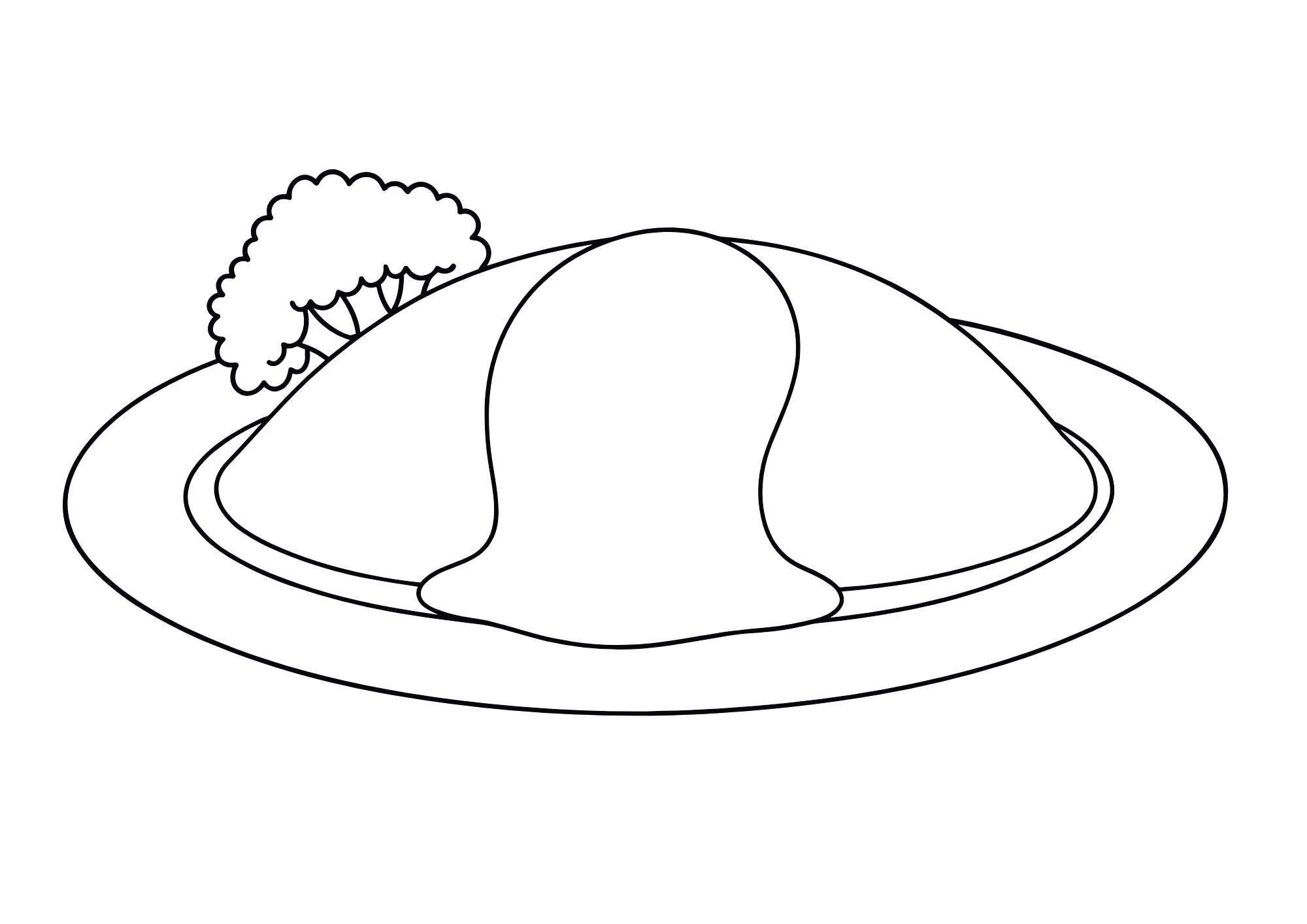 子どもたちに人気の食べ物「オムライス」がぬりえになりました。たまごのふんわりしたかたちと、たっぷりのケチャップが楽しい簡単でかわいいイラストです。食べ物に興味を持ち始めた幼児にぴったりの1枚です。