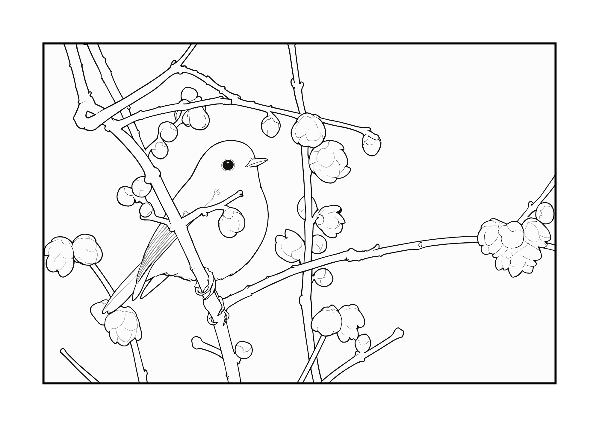冬の風物詩「蝋梅(ろうばい)」と、美しい青い羽が特徴の小鳥「ルリビタキ」を描いた、高齢者向けぬりえイラストをご紹介します。枝にとまるルリビタキの姿と、ふっくらと咲いた蝋梅の花を、じっくりと塗って楽しめます。細かすぎない構成で、塗りやすさに配慮されたデザインです。