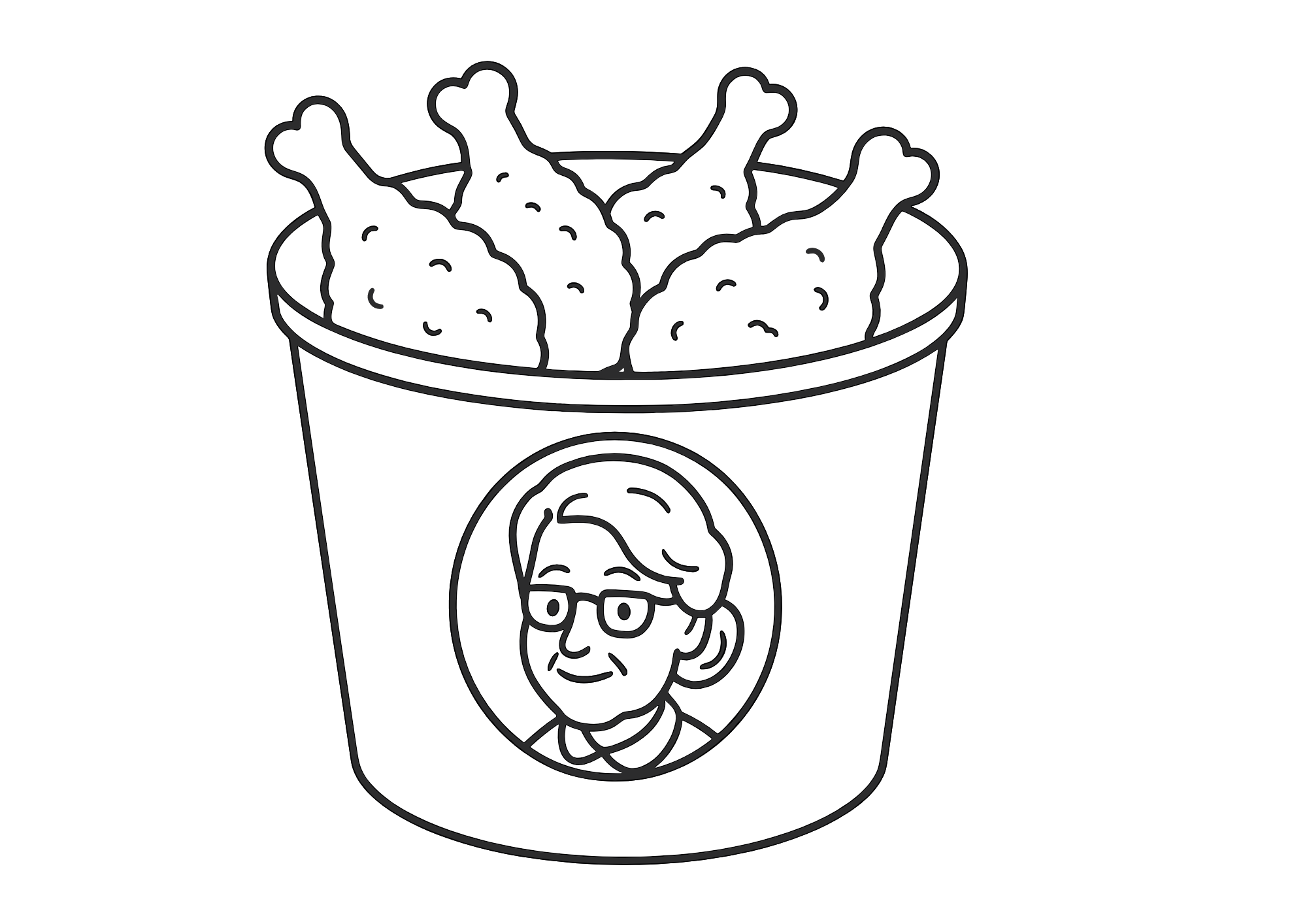 あたたかみのあるおばあちゃんのマーク入りチキンバーレルをモチーフにした、高齢者向けの無料ぬりえイラストです。なつかしいファーストフードのイメージを楽しみながら、色を塗って手指の運動や脳トレに活用できます。