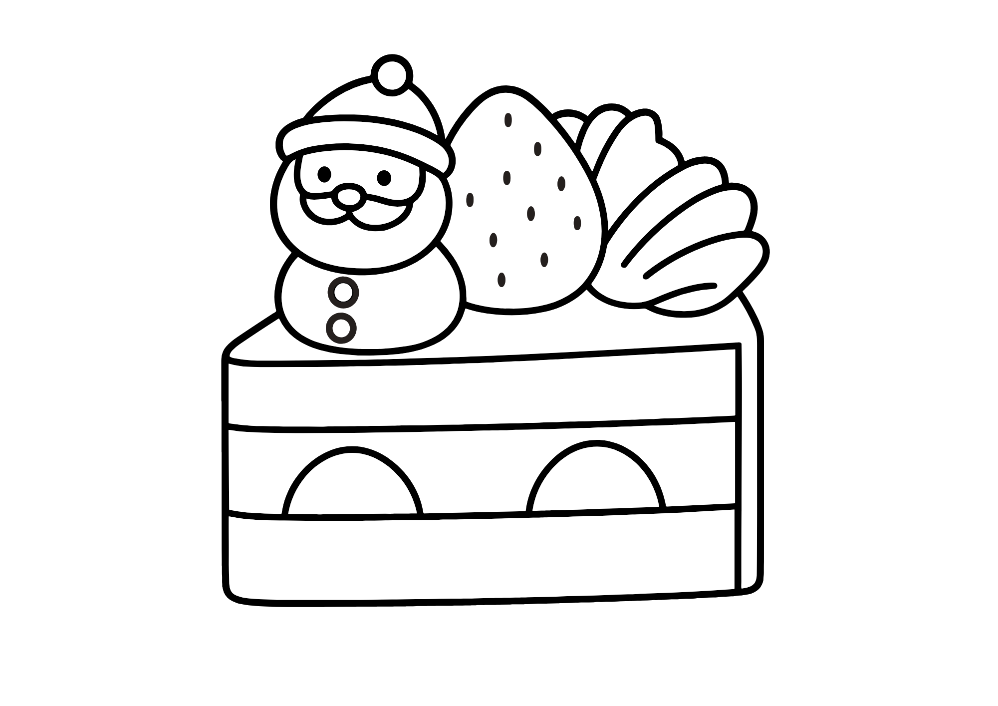 クリスマスにぴったりな、サンタ人形といちごがのったショートケーキのぬりえをご紹介します。ふんわりとしたホイップクリームと、かわいらしい表情のサンタクロースがポイント。2層のスポンジに赤い果実の断面が描かれた、塗りやすくて見栄えのよい構図です。