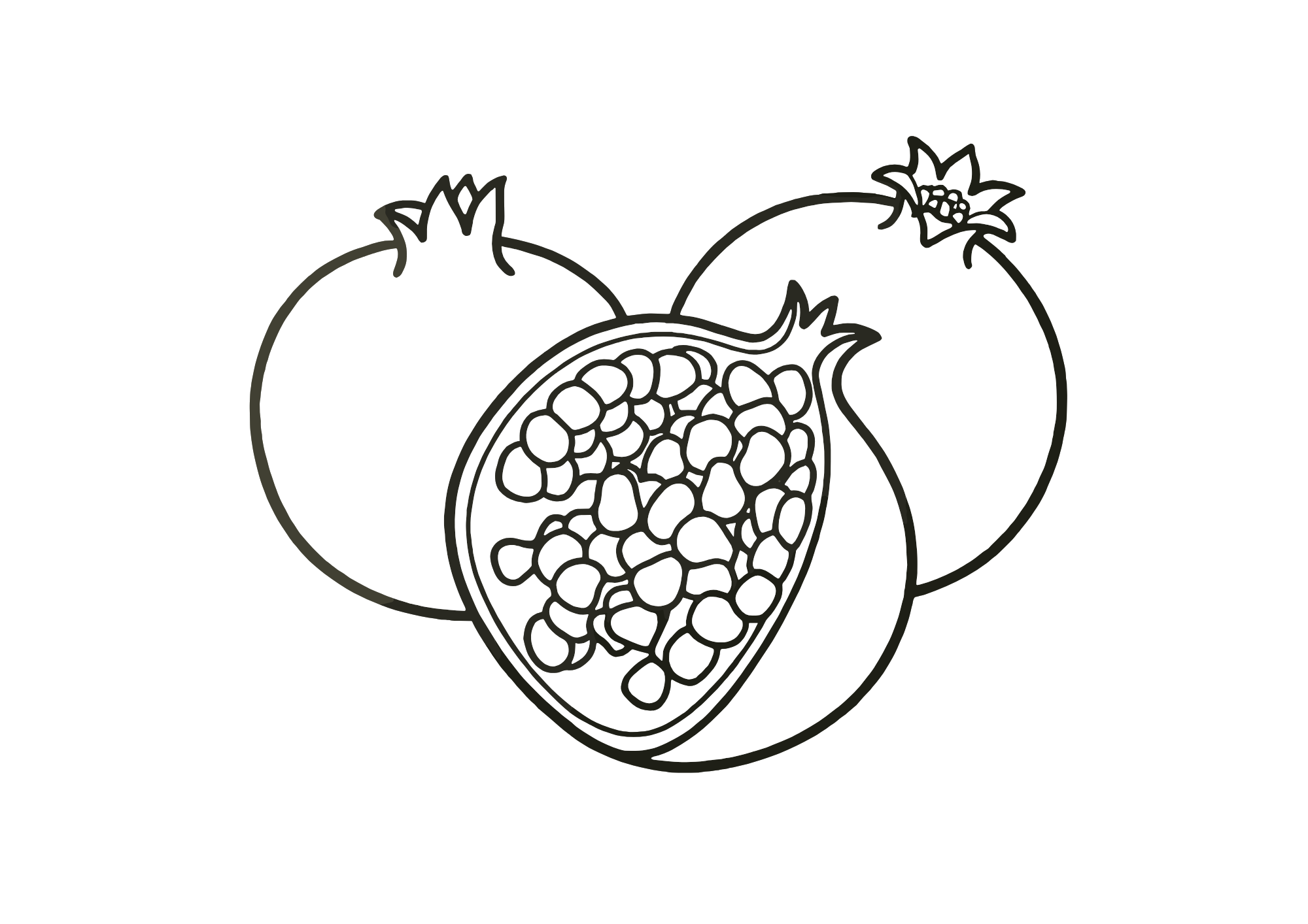 秋に旬を迎える果物「柘榴(ざくろ)」をモチーフにした、高齢者向けの塗り絵イラストをご紹介します。実のつまった断面と丸い果実が3つ描かれており、シンプルながらも塗りごたえのある構図です。細かすぎない粒や輪郭線で構成されており、視認性と塗りやすさを意識して制作しました。