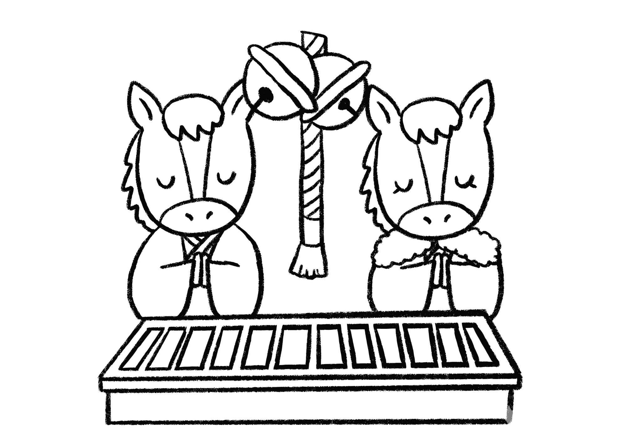 • モチーフ: 初詣をする馬(鈴・賽銭箱付き)