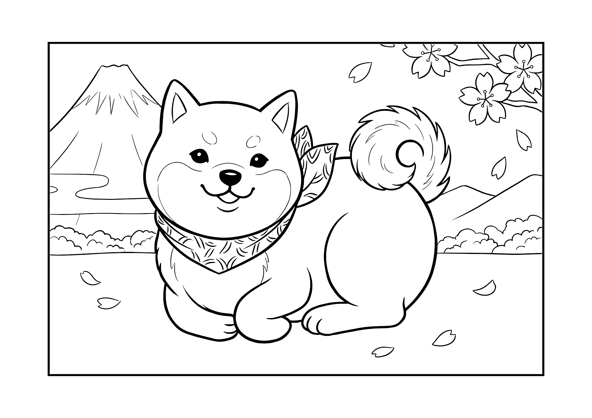 春の癒しをテーマにした、柴犬と桜・富士山の塗り絵をご紹介します。笑顔の柴犬が春の風景の中にたたずむ構図で、高齢者向けに塗りやすくデザインされたイラストです。季節感たっぷりの塗り絵で、心を穏やかに過ごしましょう。