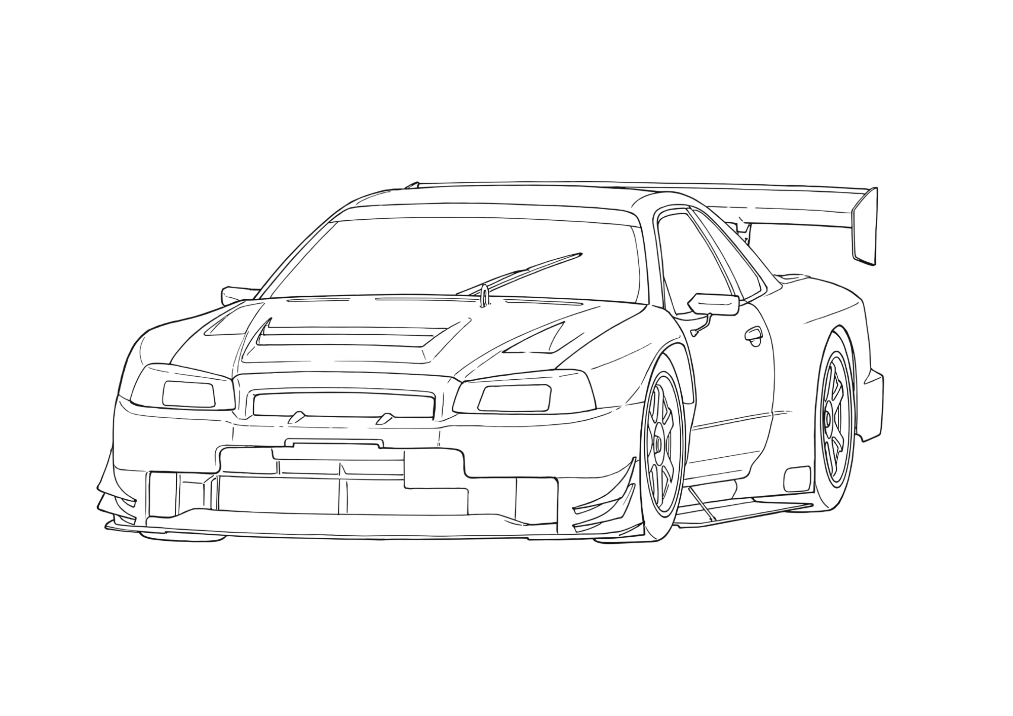 車好きの大人におすすめの、レーシング仕様のGTRをテーマにした塗り絵イラストです。ディテールにこだわった線画は趣味時間の充実やストレス解消にもぴったり。本格的なモチーフで自由なカラーリングをお楽しみください。