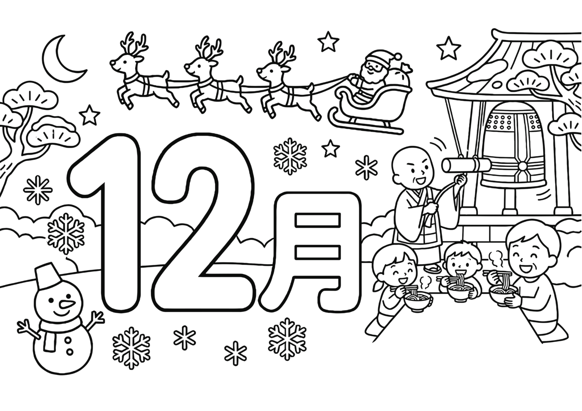 サンタクロース、除夜の鐘、年越しそばなど、12月の風物詩を詰め込んだ塗り絵です。太めの線で塗りやすく、2〜6歳の幼児から高齢者のレクリエーションまで幅広く活用できます。