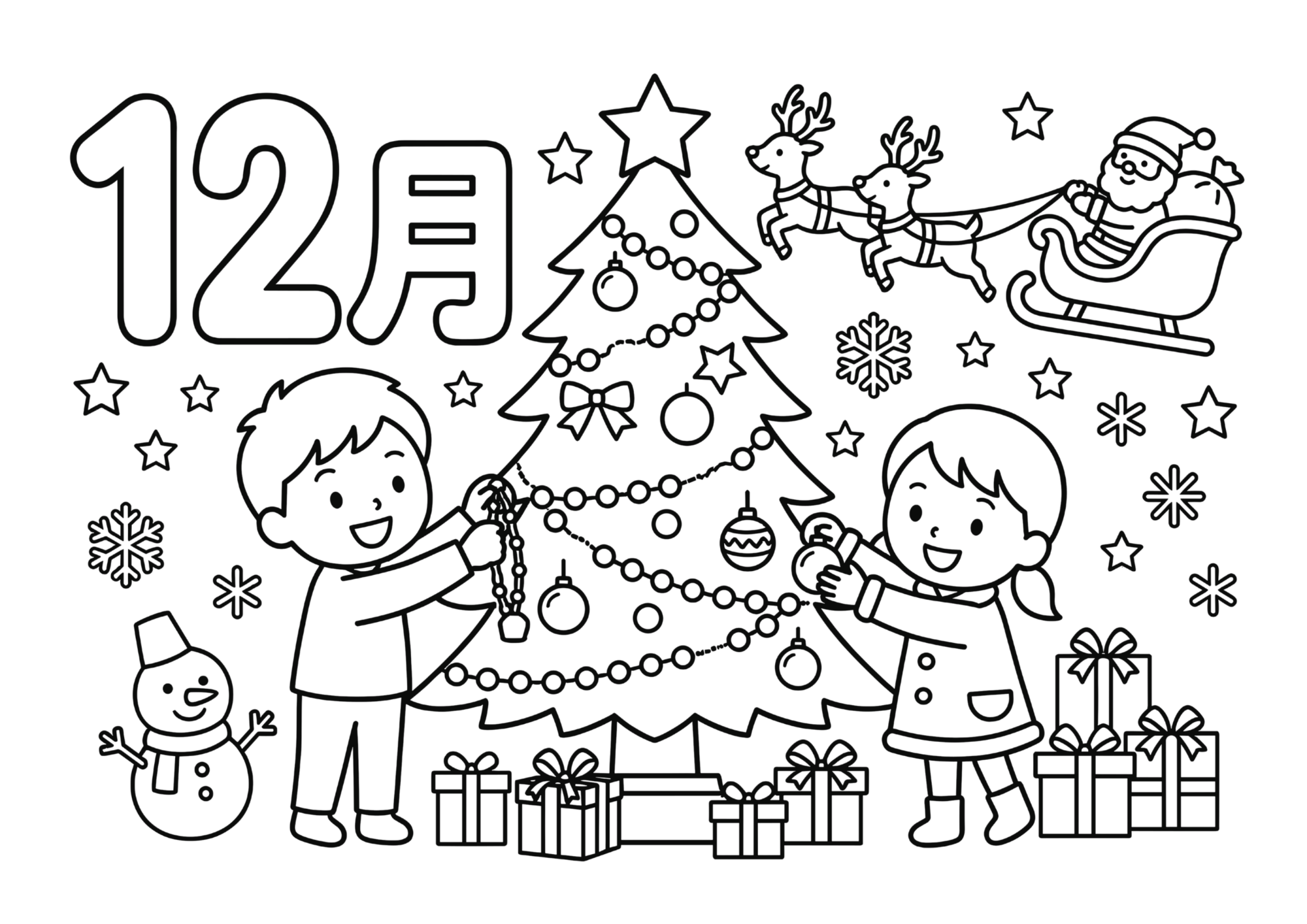 12月のぬりえ|子どもたちがクリスマスツリーを飾る様子の無料イラスト素材