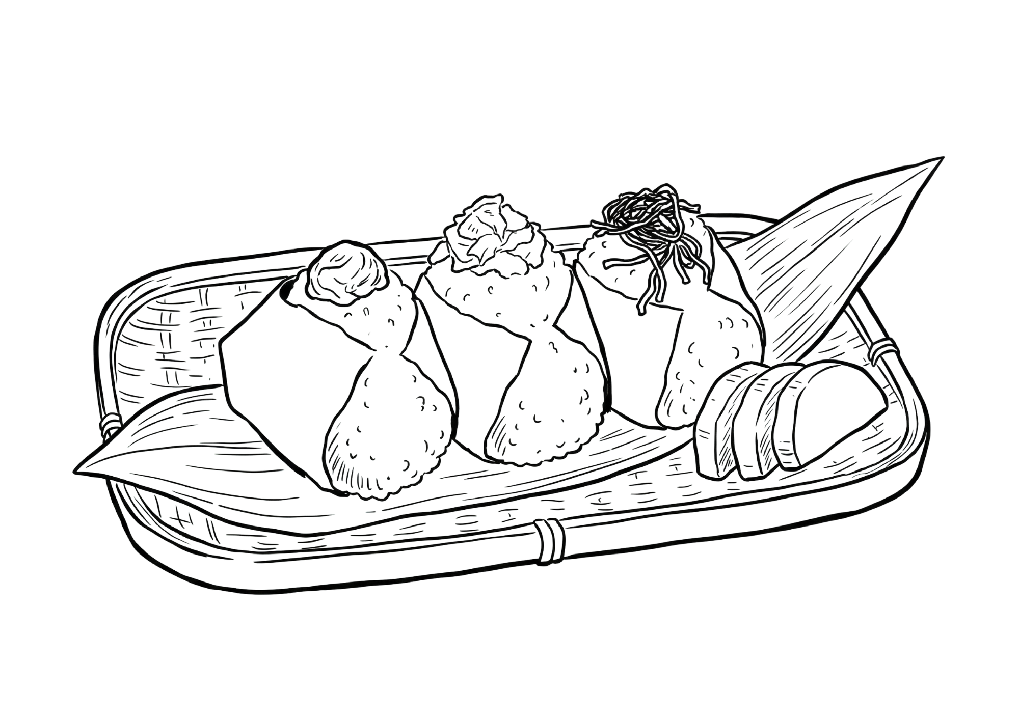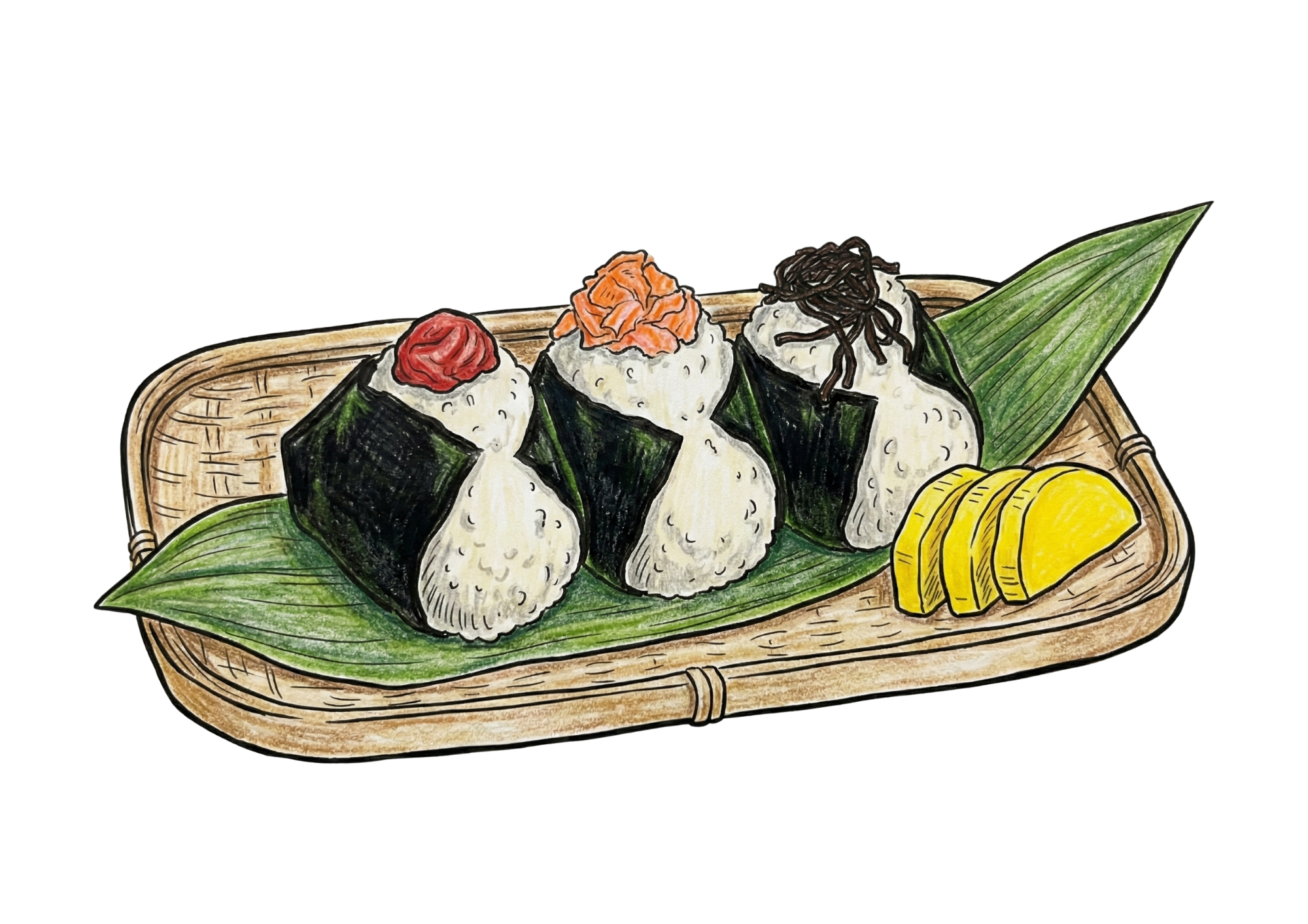 梅干し、しゃけ、こんぶのおにぎりが並んだおいしそうな和食のぬりえです。大きくて塗りやすく、高齢者向けにデザインされた無料ぬりえ素材です。