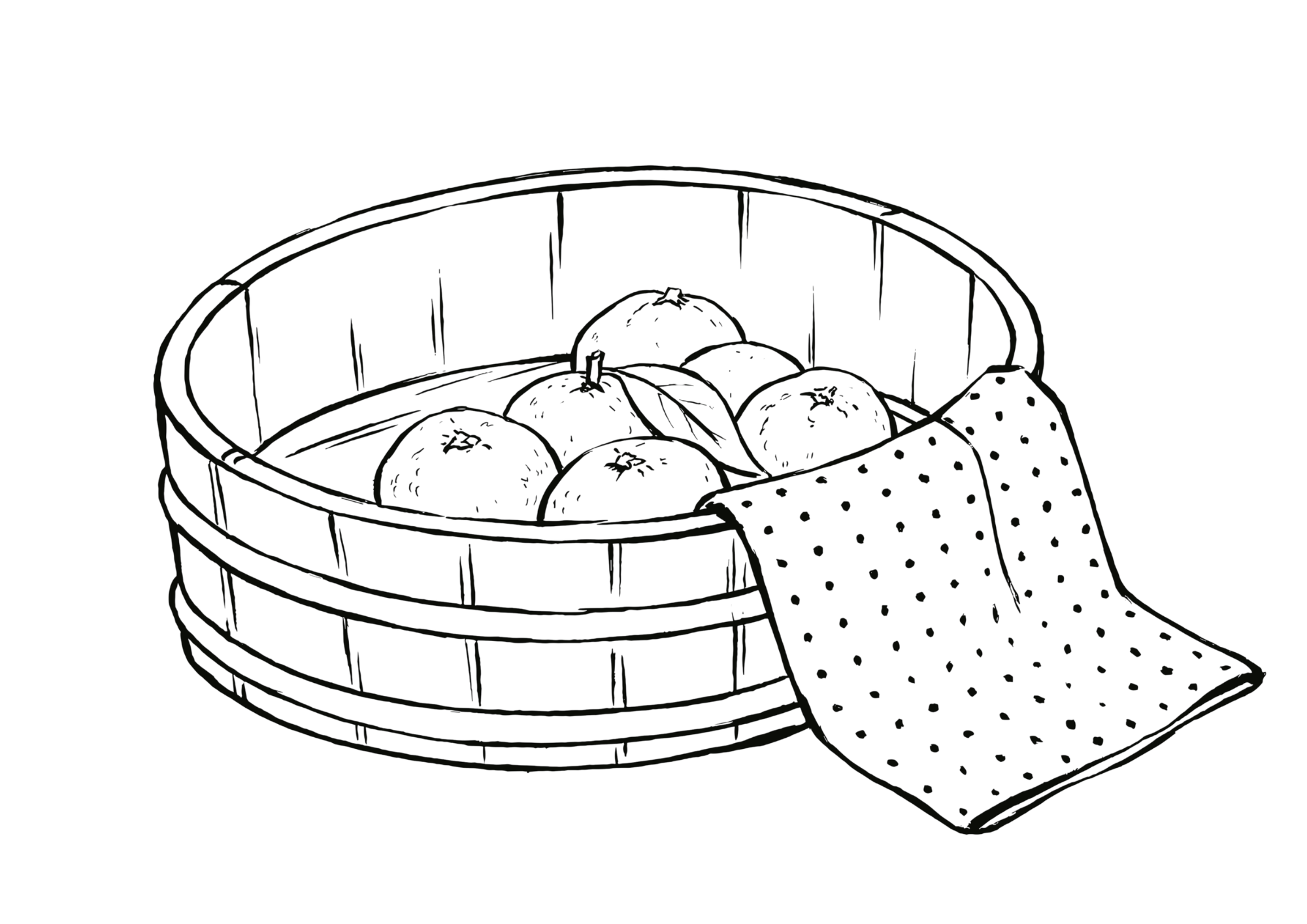 木桶に入ったゆずが描かれた、冬至の季節にぴったりのぬりえです。高齢者の手指運動や季節レクリエーションとしても最適な、無料イラスト素材です。