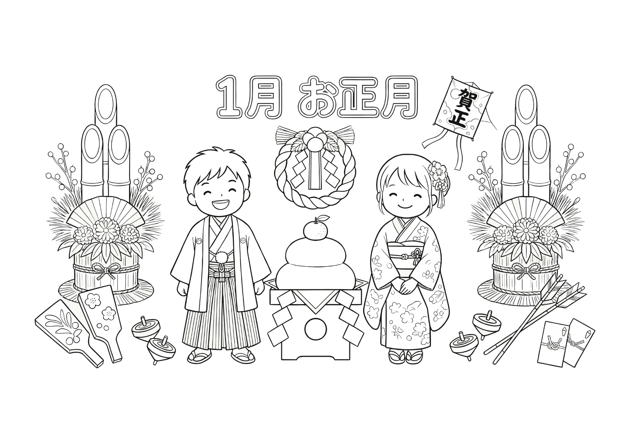 1月のお正月を華やかに彩る、縁起物たっぷりの塗り絵イラストです。着物を着た子供たちや門松、鏡餅、羽子板などが丁寧に描かれ、子ども向けの知育にも、高齢者の脳活にもおすすめの無料素材です。