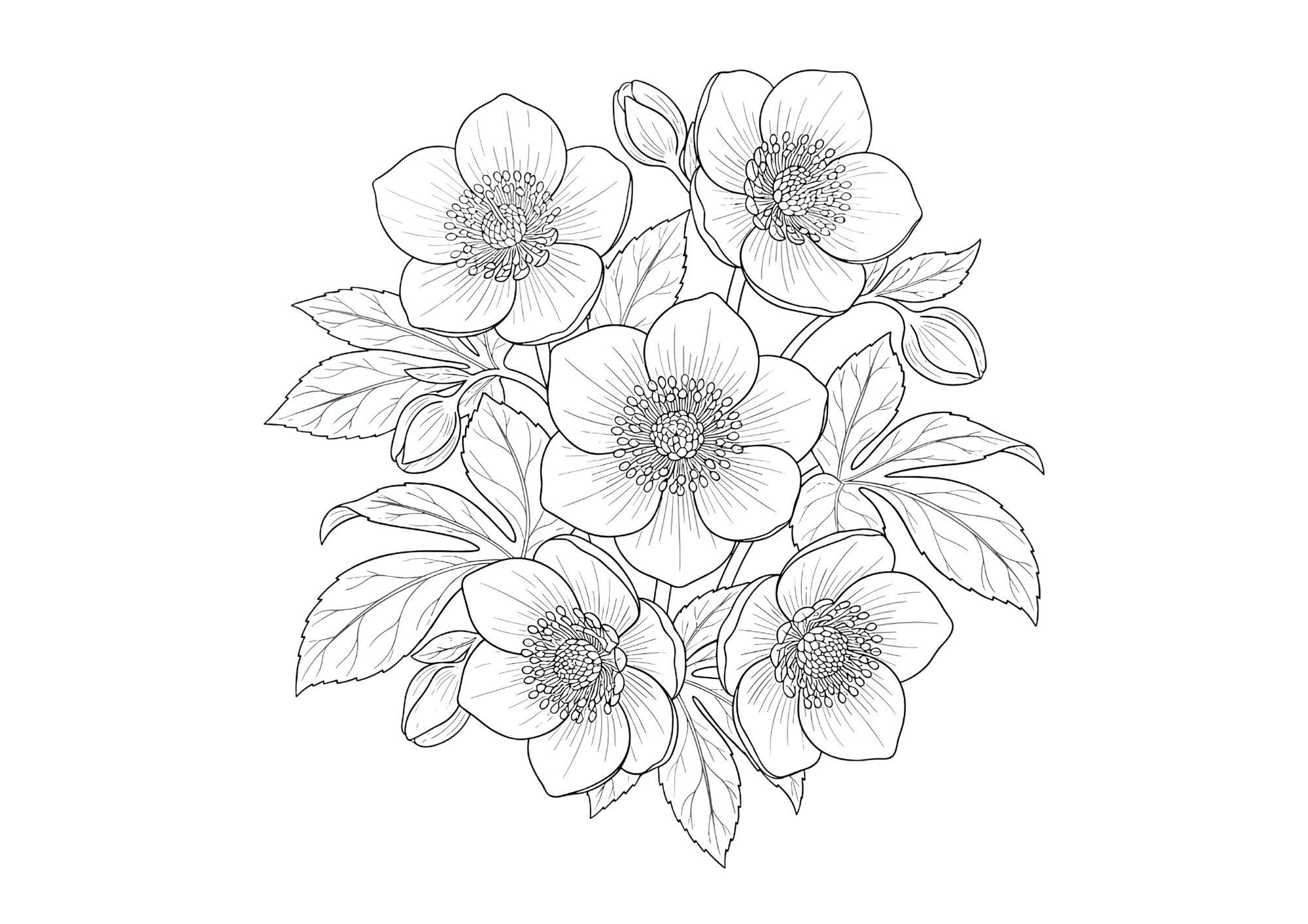 冬から早春に咲くクリスマスローズの花を描いたぬりえです。上品で静かな色合いが魅力的で、高齢者の脳トレや季節のレクリエーションにぴったりの無料素材です。