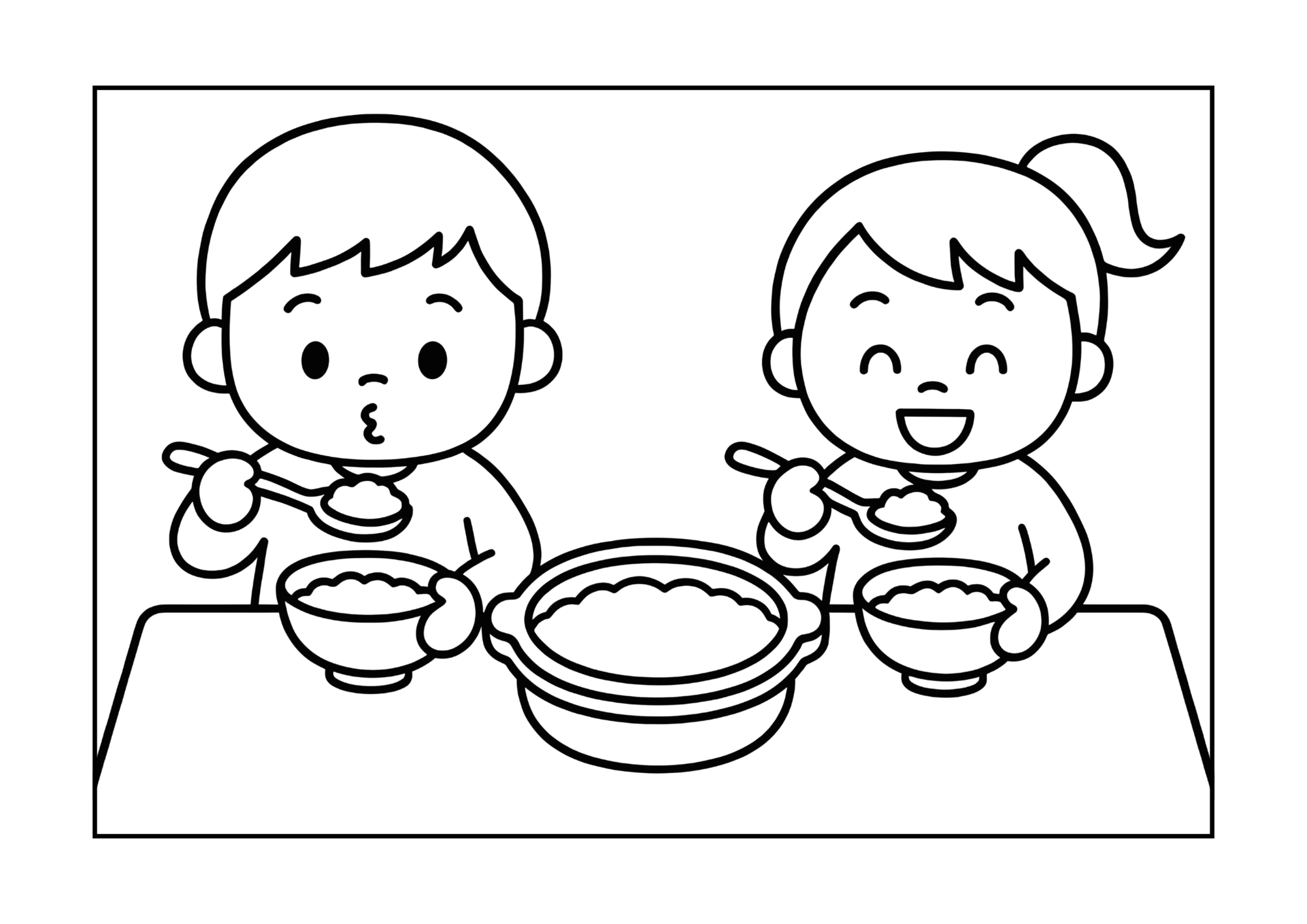 春の七草を使った「七草がゆ」を食べる子供たちのぬりえです。1月7日の行事に合わせた食育や行事理解にぴったり。保育園・幼稚園・ご家庭で使える幼児向けの無料教材素材です。
