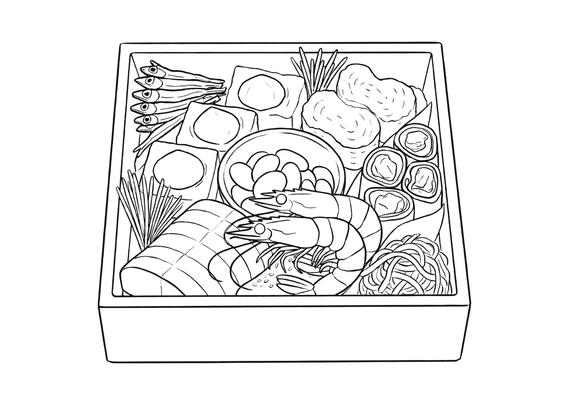 お正月といえば「おせち料理」!縁起の良い料理を詰め合わせたお重箱のぬりえです。高齢者のレクリエーション・行事食理解・子どもへの食育教材としても活用できます。
